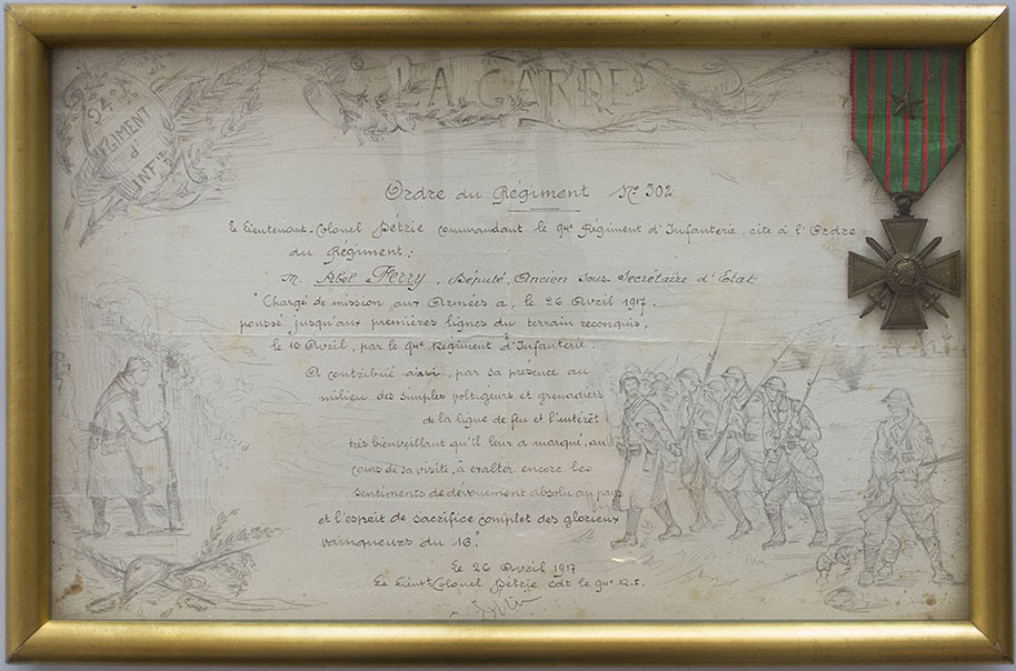 Lors de sa mission concernant l’offensive du Chemin des Dames, il visite le 26 avril 1917 le 94e régiment d’infanterie – héritier de la Garde impériale et surnommé « La Garde » – qui avait conquis et conservé au prix de nombreuses pertes une portion de terrain de 3 km de profondeur, devant Berry-au-Bac (Aisne).