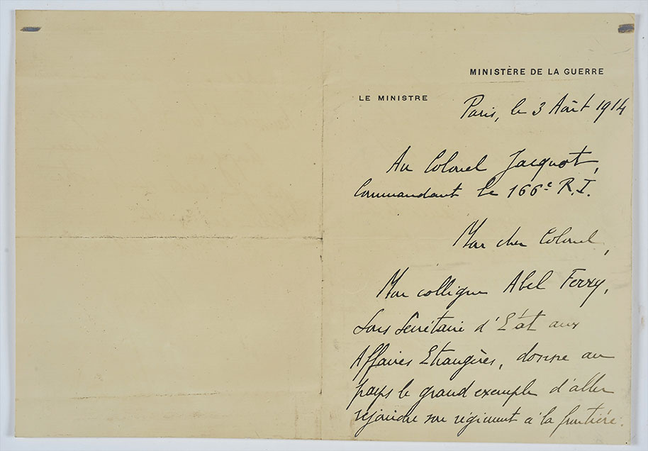 Dès le 3 août il a rejoint le 166e régiment d’infanterie qui combat devant Verdun et sur demande d’Adolphe Messimy, ministre de la Guerre du premier gouvernement Viviani, il a été nommé sergent puis immédiatement après, lieutenant.